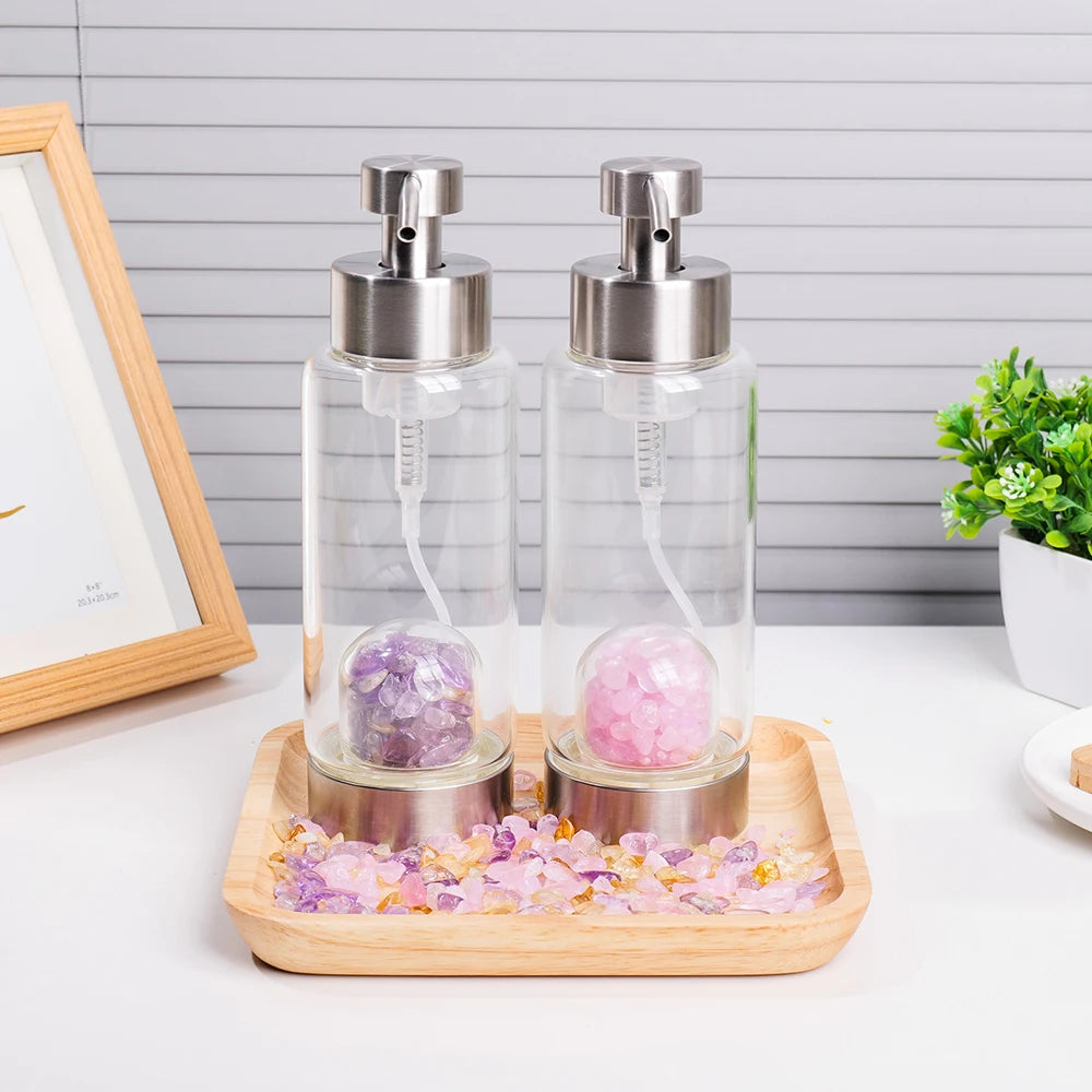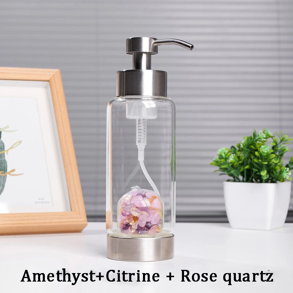 Este dispensador de vidrio incluye piedras naturales en su base (como cuarzo rosa o amatista), canalizando su energía directamente hacia cada gota que utilizas. Ya sea para shampoo, jabón líquido, gel íntimo o aceites florales, este envase convierte el cuidado personal en un ritual vibracional.