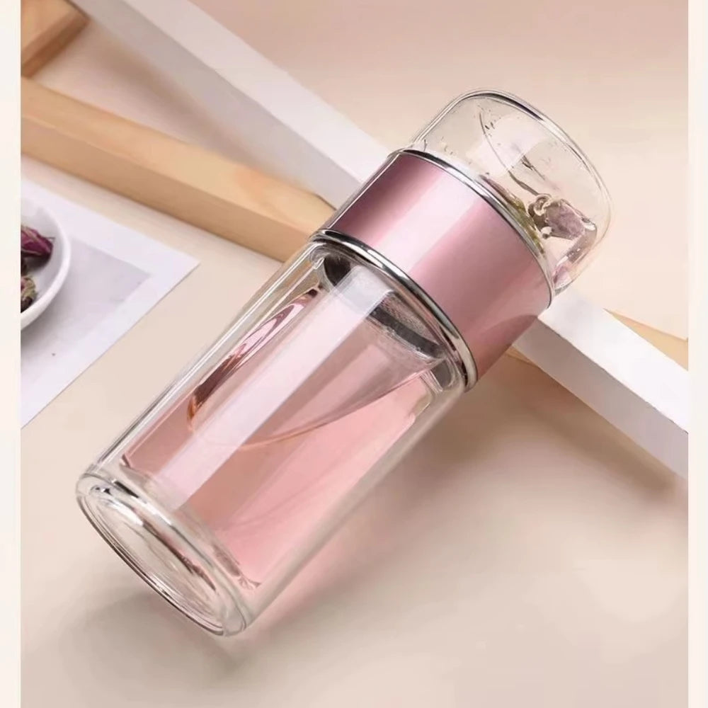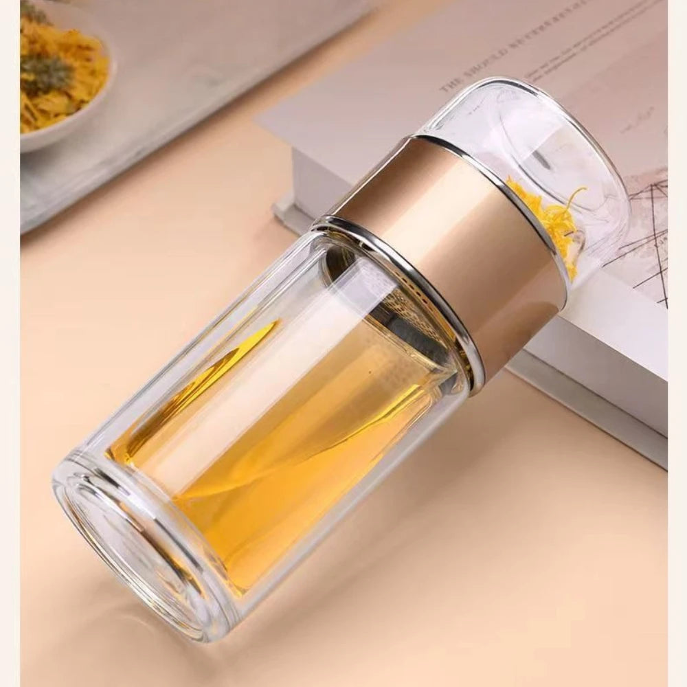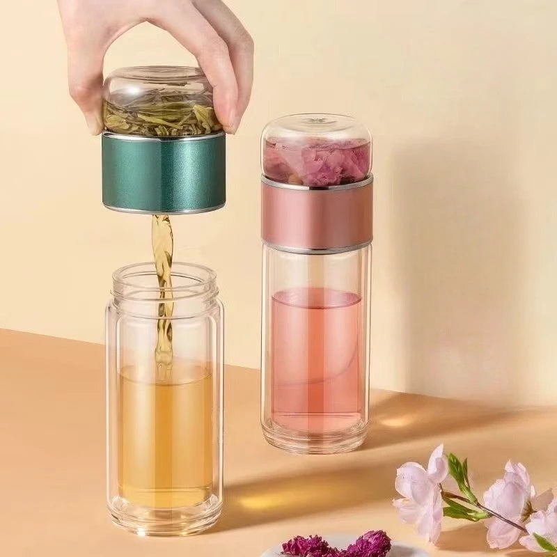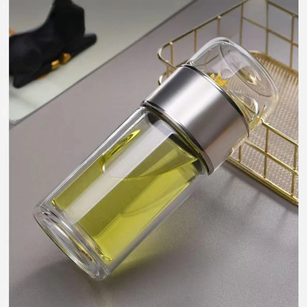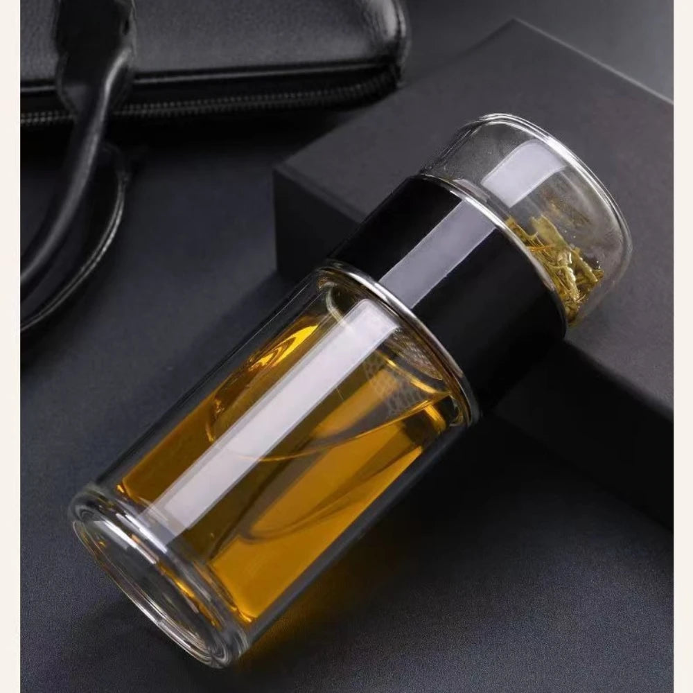 Esta botella de vidrio de doble pared está diseñada para conservar la temperatura mientras protege tus manos, ideal para tés herbales y rituales de plantas sagradas.