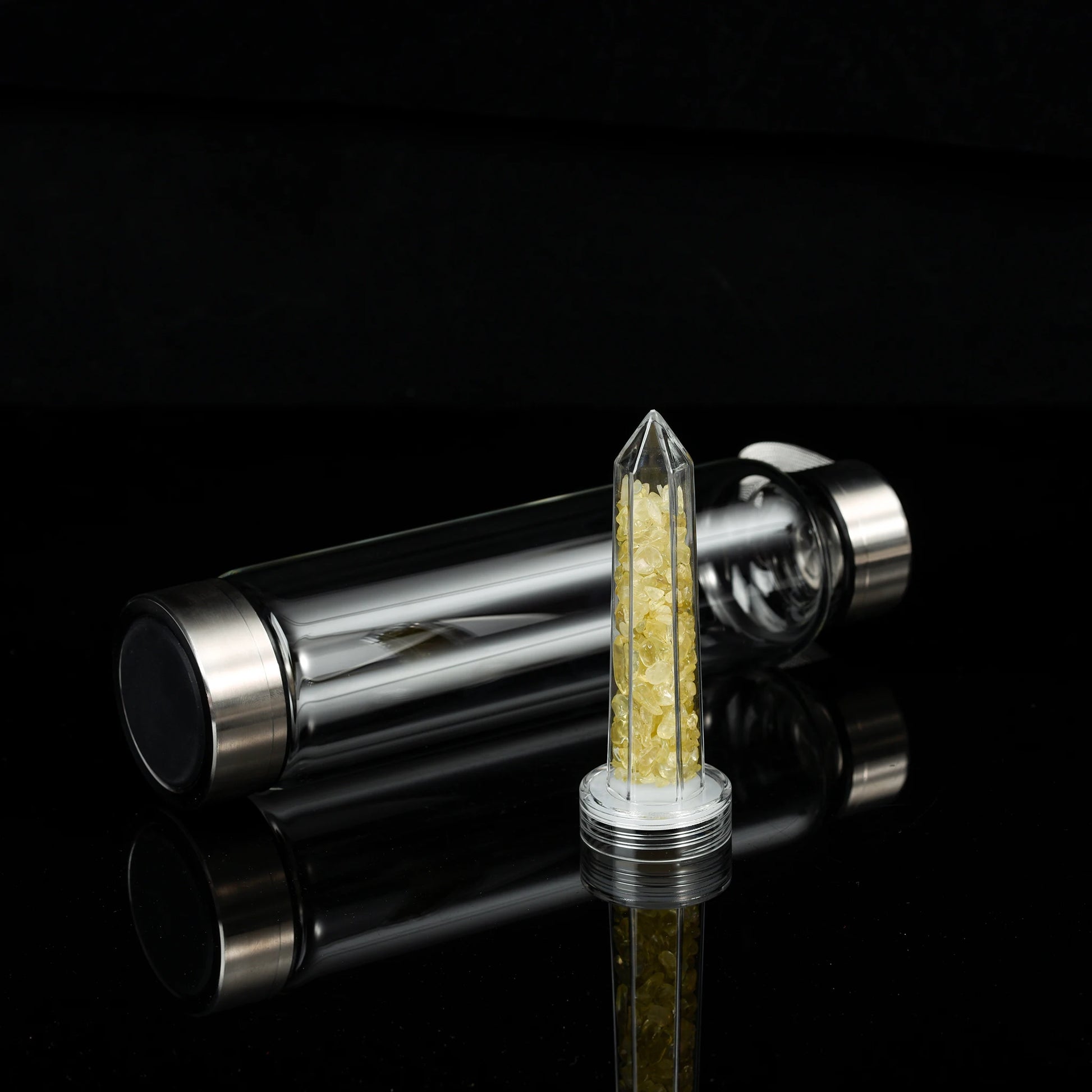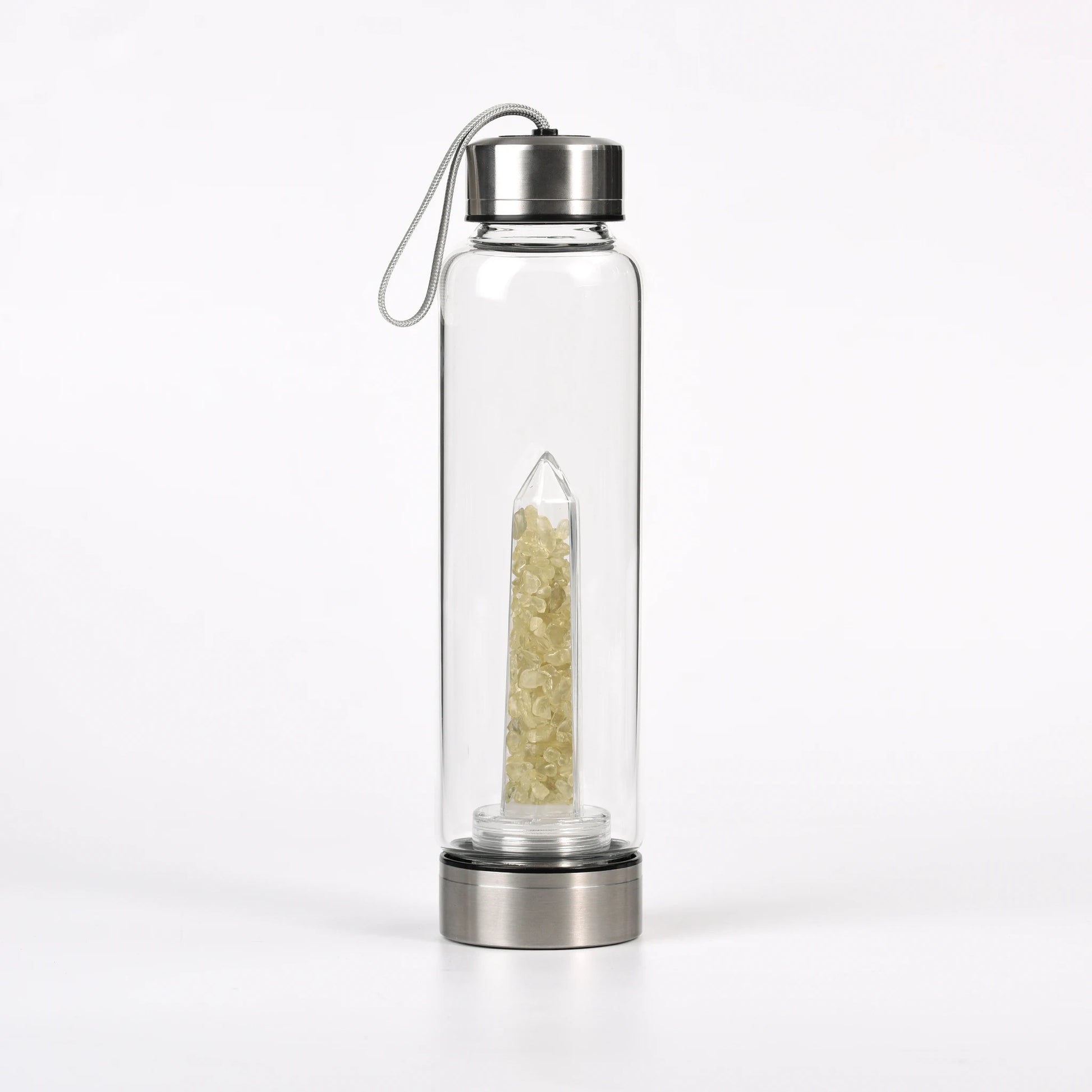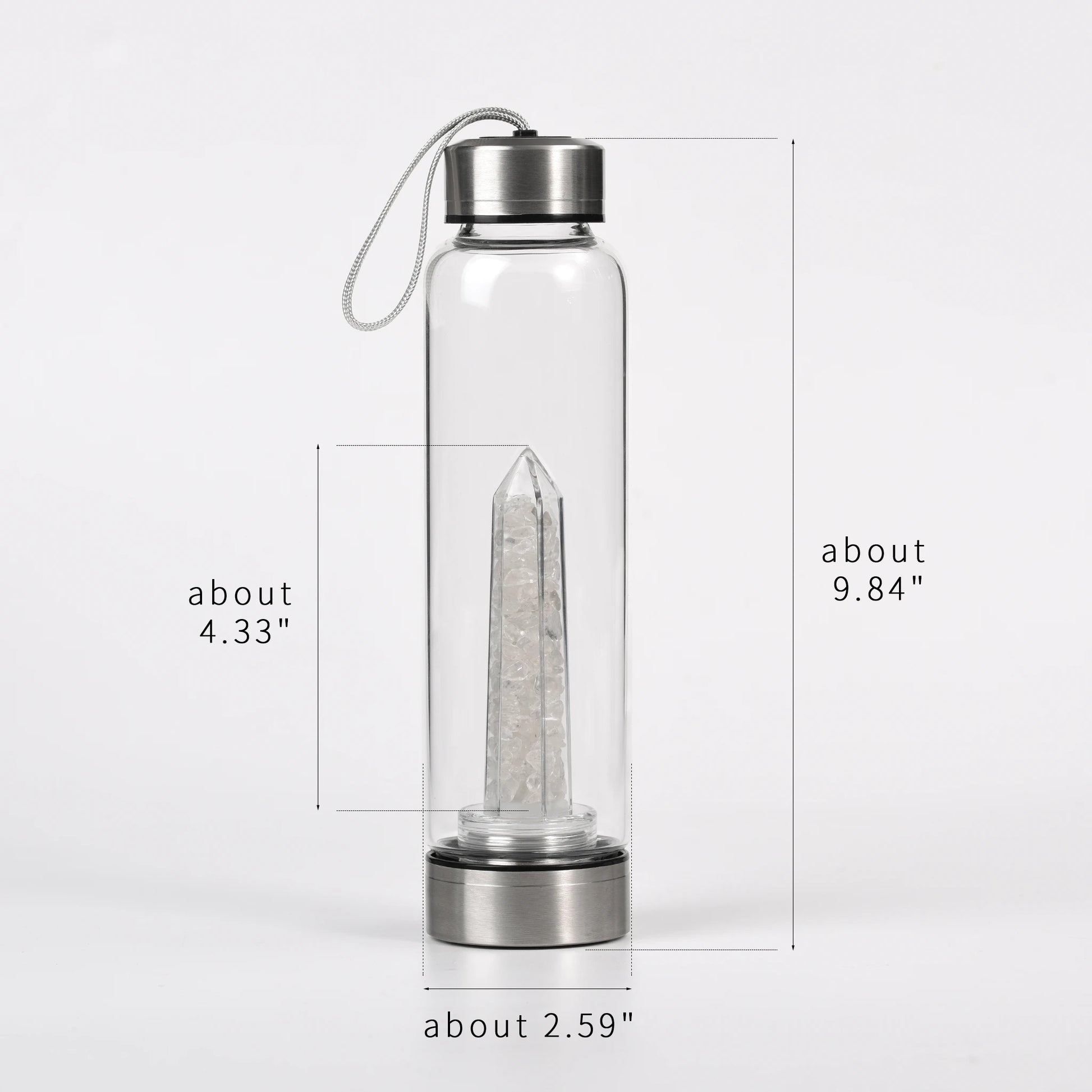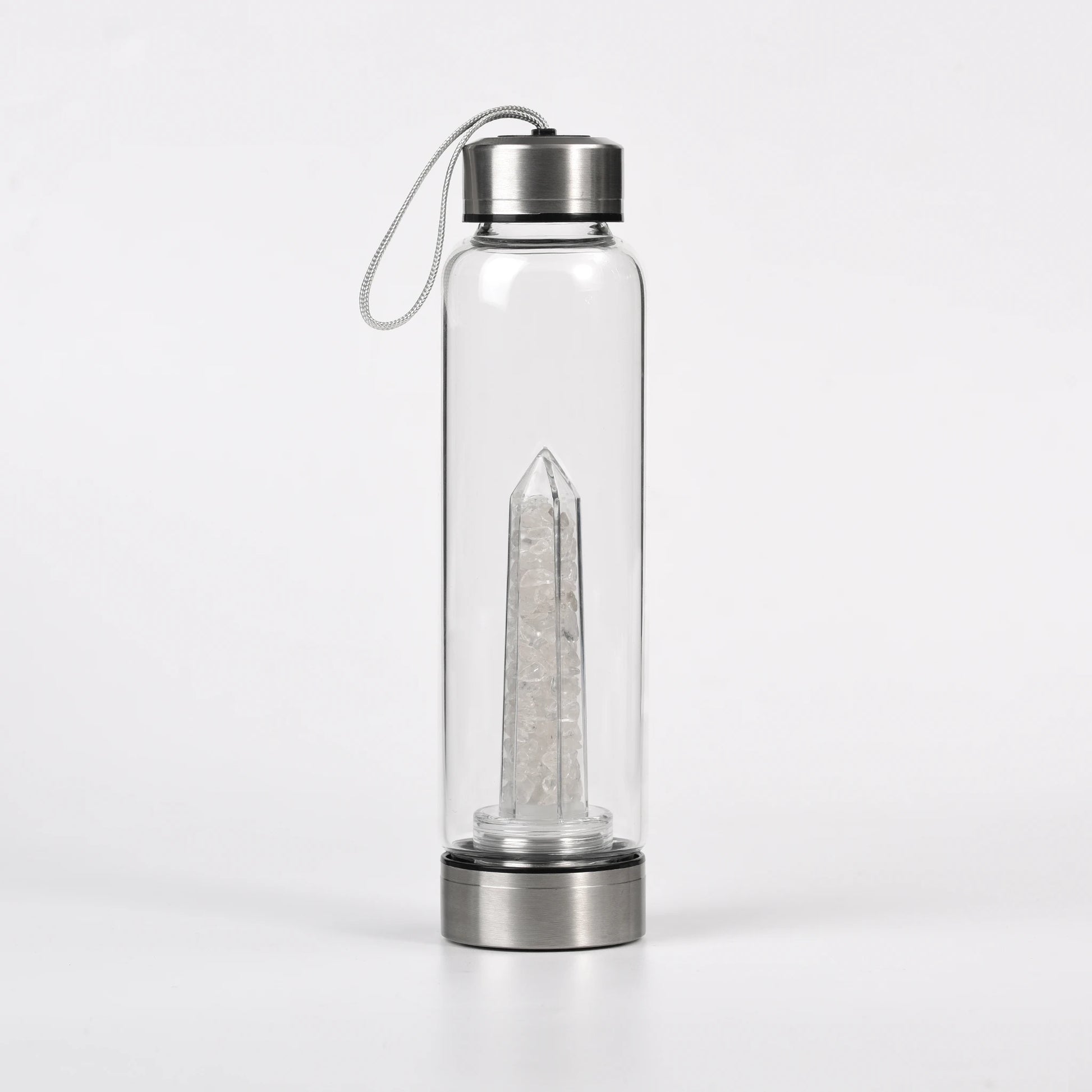 Eleva tu experiencia de hidratación con esta botella energética de vidrio, diseñada para transformar el agua en una fuente vibracional de luz y bienestar.